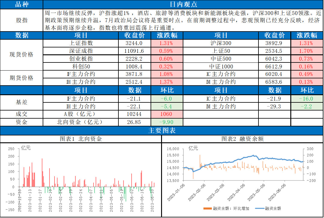 周一市场继续反弹,沪指涨超1%,酒店、旅游等消费板块和新能源板块走强,沪深300和上证50领涨。东吴期货股指研究员认为,近期政策预期继续升温,7月政治局会议将是重要时点。在前期调整过程中,悲观预期已经充分反映,经济基本面将逐步企稳,指数也将重回震荡上行通道。(仅供参考,不构成对任何人的投资建议)