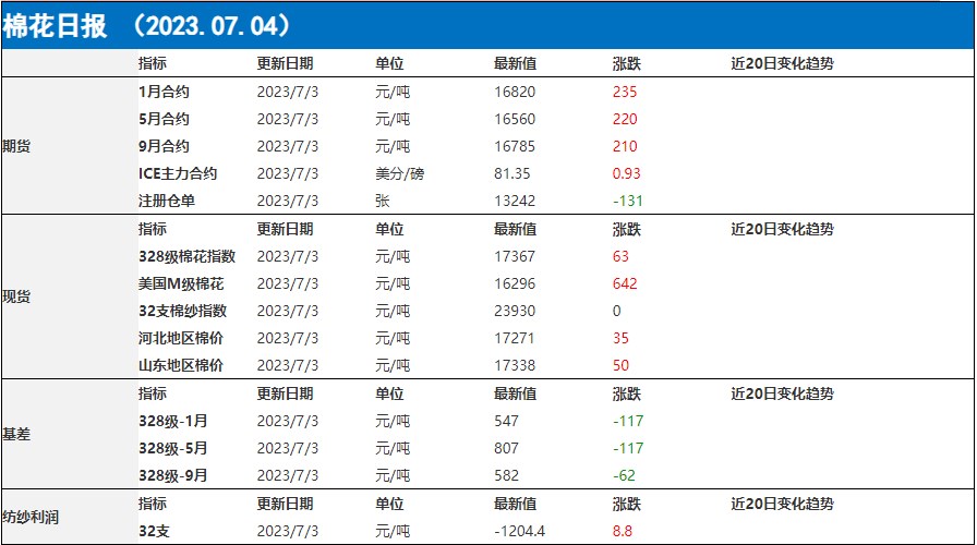 周一,洲际交易所(ICE)的棉花期货上涨,其中基准12月期棉收高1.29%,这也是连续第四个交易日上涨,主要是受到棉花种植带天气不利,以及上周五种植面积报告的支持。最新美国干旱监测显示,约18%的棉花种植面积处于干旱地区,高于之前的16%。上周美国棉花的优良率为49%,高于之前的47%,去年同期的优良率为37%。ICE棉花交易所将于周二休市,以纪念独立日。