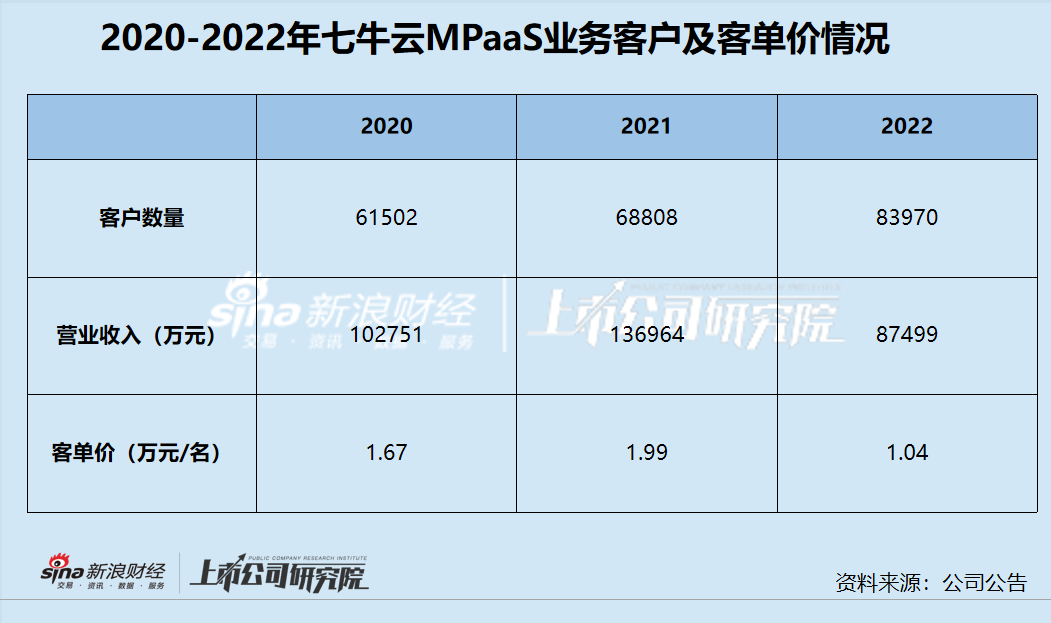 资料来源:招股书需要注意的是,收入规模缩水的同时,七牛云的MPaaS客户规模却只增不减,客单价随之腰斩。据招股书显示,MPaaS的付费客户数量从2020年的61502名增至2021年的68808名,再增至2022年的83970名,但由于收入的骤减,其客单价从2021年的近2万元下降至2022年的1.04万元,或在一定程度上说明七牛云的MPaaS业务需要降价来维系、吸引客户,而即便如此,也未能在收入规模上带来弥补,业务竞争力或明显下降。