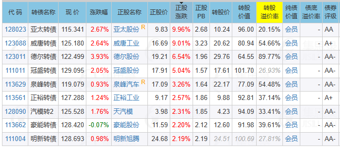 近期智能汽车及汽车零配件转债也非常活跃,目前130元以下汽车零配件的转债清单如下(按正股涨跌幅排列):