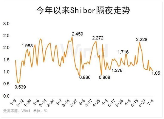 市场资金面充裕,上海银行间同业拆放利率持续走低。Wind数据显示,6月中旬,Shibor隔夜一度曾上涨到2.228%,离今年最高点并不远。不过最终未能突破,随后拐头向下快速走低,6月29日仅报1.086%,创一个多月新低。季度末最后一天6月30日有所回升,随后7月初开始继续下探,7月6日报1.048%,创2个多月新低。