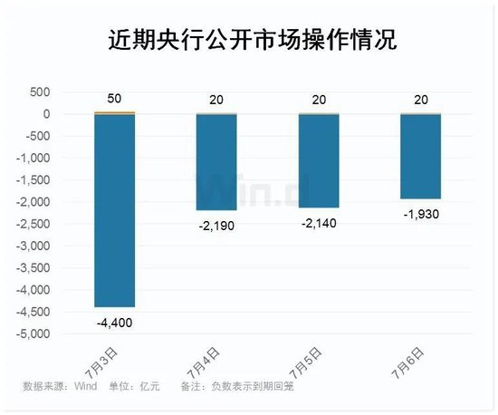 以央行公开市场操作逆回购来看,6月末央行连续大额投放,7月初逐渐到期,使得净回笼规模大。Wind数据显示,7月目前4个工作日央行合计投放资金仅110亿,同期逆回购到期回笼达10660亿,实现净回笼资金超过1万亿。可见本周每个工作日央行公开市场中资金回收明显,不过仍满足银行间资金需求。
