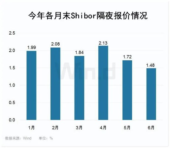 此外对比今年各个月末最后一个交易日利率来看,一季度各月基本在2%附近波动,二季度则是逐步走低。其中4月末达到2.134%、5月末降为1.716%、6月末再度快速下降到1.484%。二季度市场资金面平稳,银行间流动性较充裕。