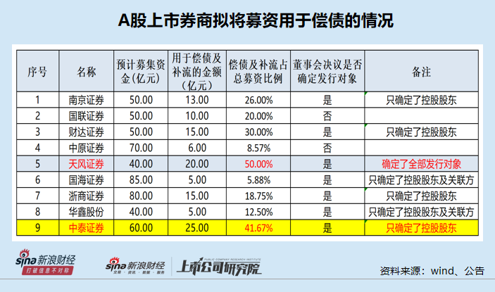 来源:中泰证券公告其中,中泰证券打算用来偿还债务的金额占募资总额的比例高达41.67%,超过了30%的“红线”。