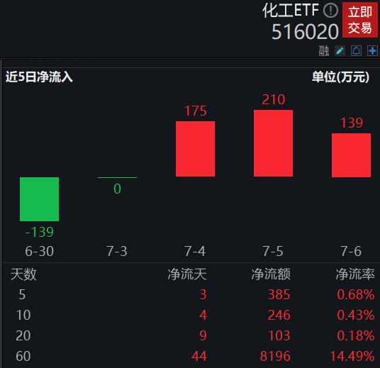 从行业代表ETF资金面看,本周资金再度小步进场,持续逢低揽筹。以化工ETF(516020)为例,公开数据显示,本周二以来该ETF已经连续3日净申购状态,累计净申购额524万元。