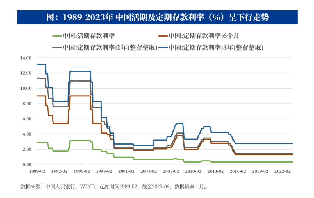 放眼更长维度,我们或置身于利率中枢下移的大趋势中。根据中国人民银行数据,1-3年定期存款基准利率从90年代的10%左右水平,下降到了如今2%上下区间。