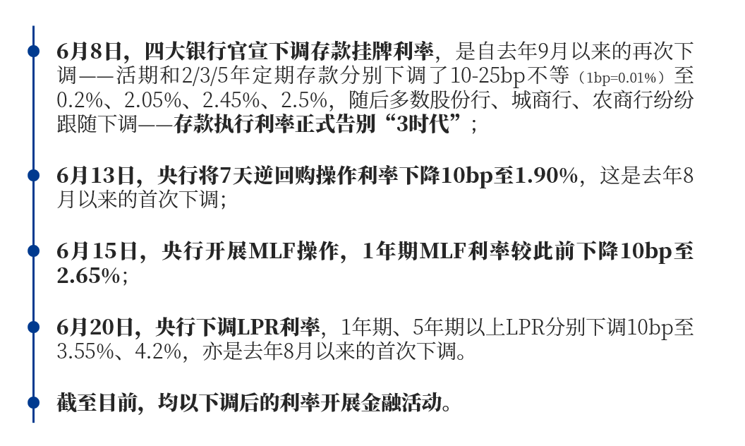 另一边,年中商业银行也下调了存款利率10-25bp不等(1bp=0.01%),是自去年9月以来的又一次下调。