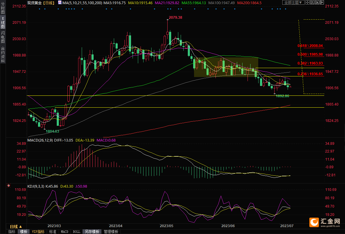 整体来看,虽然美元的回落和避险情绪仍给金价提供一些支撑,但美国就业市场的强劲表现不仅强化了7月份加息预期,还提高了11月再度加息的预期,降低了经济衰退预期,美债收益率强势上涨,全球多数央行至少还有一次加息需求,这令金价短线面临进一步下行风险,如果跌破1900关口,短线可能会试探3月15日低点1885.66附近支撑,中线可能会跌向200日均线1865附近。上方留意21日均线1930附近阻力,若能顶破该阻力,则增加短线看涨信号。