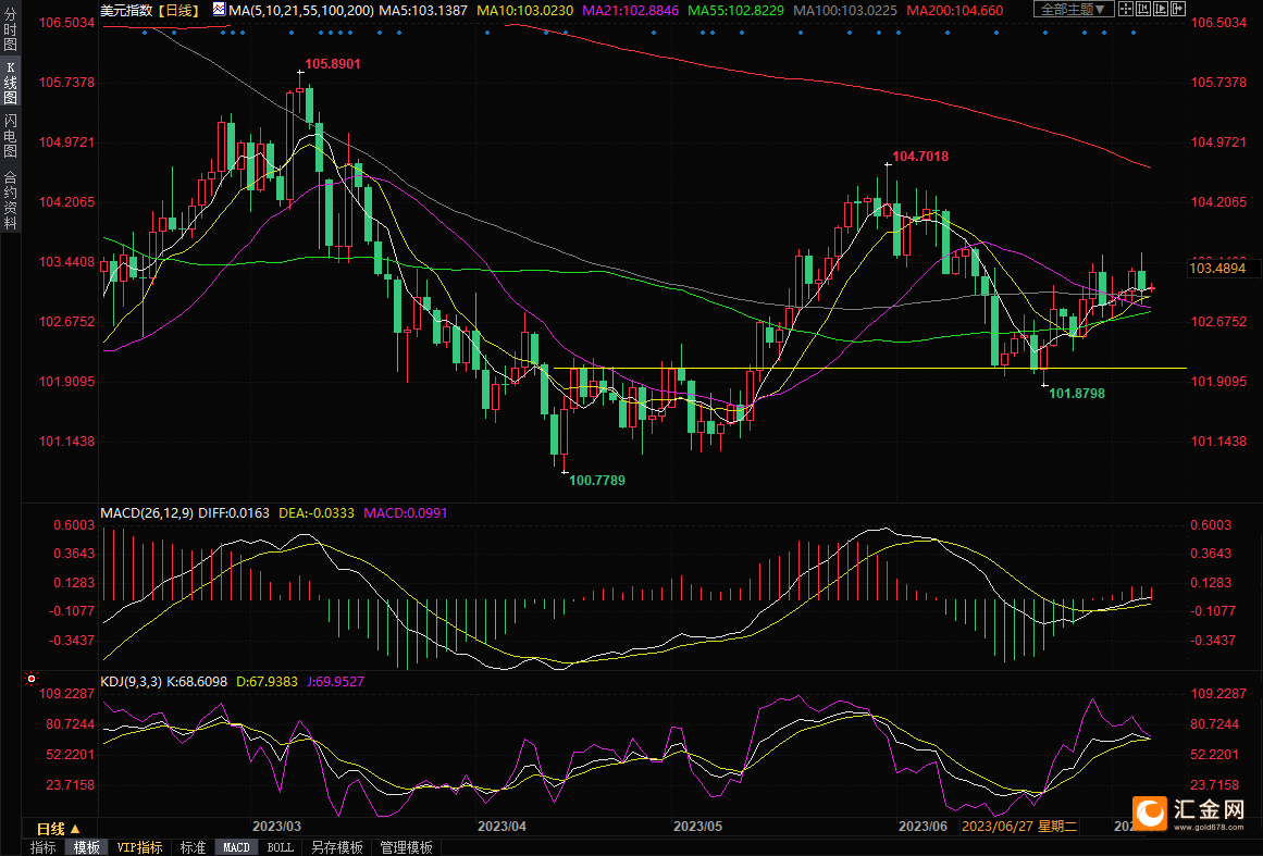 美元指数美元指数一度创近三周新高至103.58,但收盘下跌0.23%,收报103.12附近。周四亚市,汇价窄幅震荡,目前交投于103.13附近。