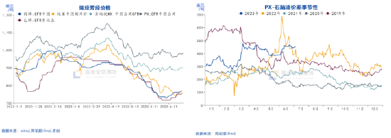 但PX的高估值回落的方式可以是PX价格的主动下跌,也可以是石脑油价格的回升。而石脑油价格的回升更多需要依赖终端塑料制品消费的复苏提振,或者油价的持续上行推动。无论如何,PX估值回落的过程中,都将拖累PTA使其表现阶段性弱于其他一些化工品,这是目前PTA市场重要的利空因素,但这种逻辑何时显现,可能需要更多关注美国汽油市场的表现。