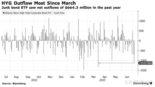 数据显示,市值130亿美元的iShares iBoxx高收益公司债券ETF(HYG.US)在最近一次可获取数据的交易中出现了11.3亿美元的流出。这是自3月份以来最大的撤资。投资者还从市值355亿美元的iShares iBoxx美元投资级公司债券ETF(LQD.US)中提取了大约7.6亿美元。