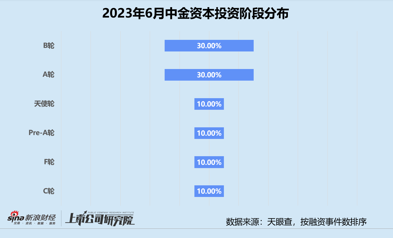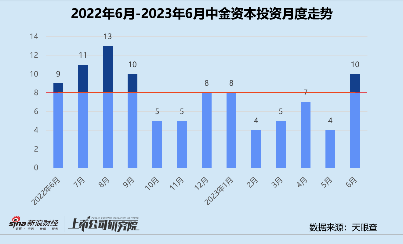统计区间内,中金资本公开披露的股权投资事件共10起,同比11.11%,约为5月投资事件数的2.5倍。往期数据显示,在一级市场普遍悲观的2022年,中金资本仍保持平均每月5-6个项目的投资频率。而本该全面复苏的2023年,中金资本却显得相对谨慎,直至本月才彻底恢复至2022年同期水平。