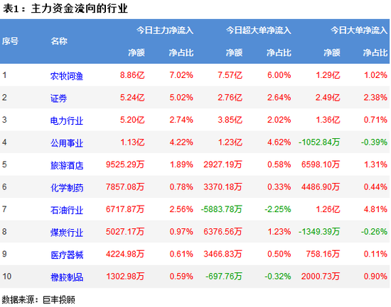 从两市行业板块资金流向来看,农牧饲渔板块获主力资金净流入8.86亿,证券板块获主力资金净流入5.24亿,电力板块主力资金净流入5.20亿,公用事业行业主力资金净流入1.13亿,旅游酒店板块主力净流入9525.29万。
