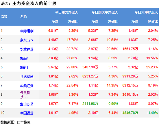 从两市个股主力资金流向来看,中际旭创获主力资金净流入6.81亿,京东方A获主力资金4.48亿净流入,农发种业获主力资金净流入4.13亿,N致尚获主力资金净流入3.83亿,N海科获主力资金净流入2.67亿。