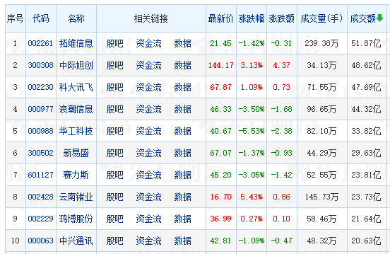 个股成交金额方面,截至午间收盘,拓维信息位列两市第一,成交金额51.87亿元;中际旭创位列第二,成交金额48.62亿元。