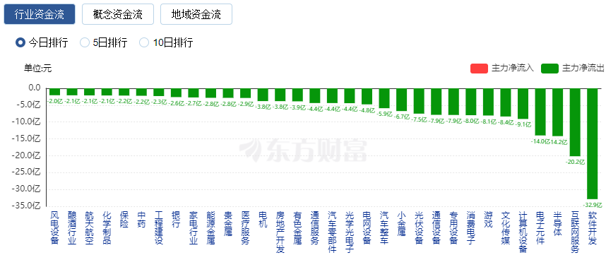 净流出方面,软件开发、互联网服务等净流出排名靠前,其中软件开发净流出32.9亿元。
