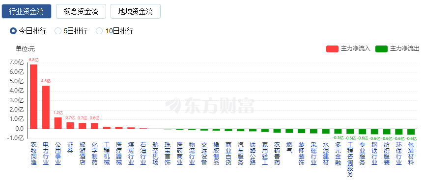 行业资金方面,截至午间收盘,农牧饲渔、电力等净流入排名靠前,其中农牧饲渔净流入6.8亿元。