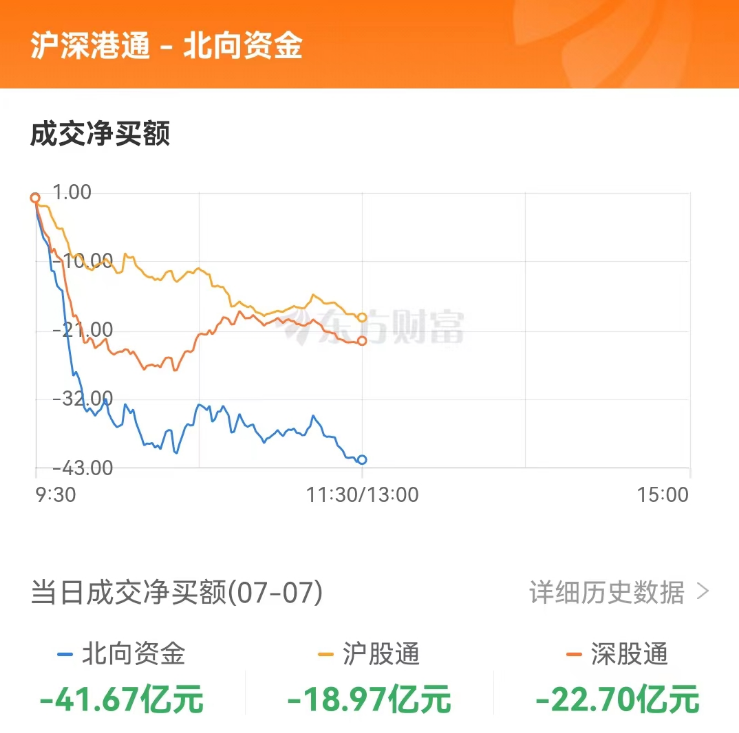 截至午间收盘,北向资金净流出,其中沪股通净流出18.97亿元,深股通净流出22.70亿元,合计净流出41.67亿元。