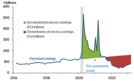 主因美国经济有望在未来3-6个月仍保持韧性。一是超额储蓄的支撑可能持续。二是紧货币向紧信用的传导仍然较缓慢,以此看美联储降息动力不足。
