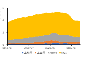 白银库存继续去化,支撑仍在。2022年白银在供需失衡以及印度的补库驱动下经历了一轮前所未有的去库,伦敦银库存降至有数据以来的历史低点。尽管当前印度补库已经告一段落,但是白银的低库存格局依旧存在。当前全球白银显性库存约为3.86万吨,创2016年11月以来新低,且仍在持续去库。供需矛盾带来的低库存格局对白银价格仍有一定支撑。