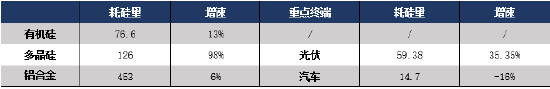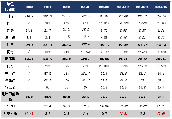 另外值得关注的点是:1)今年平衡表上游供给增速继续下降,同比增速仅为10%,产能大幅扩张后增长逐渐乏力;2)下游多晶硅消费占比一举反超有机硅领域,成为第一大需求,另外铝合金领域提振点在于新能源汽车的新增产量消费; 3)进出口方面由于海外宏观消费不景气,今年进出口消费呈现下降趋