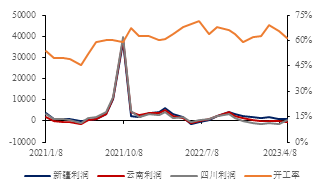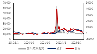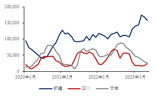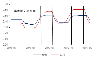 西南地区生产成本较高,新增产能只占其中一小部分,并集中在下半年。当前西南地区成本倒挂较多,开工意愿较低,若下半年继续维持亏损状态,新增产能或推迟,但是我们观察到进入第二和第三季度,西南产区便进入到丰水期和平水期,电价均会不同程度地下降,即使是平水期也比枯水期的生产成本低,利润情况改善,开工和投产意愿或增加。若代入往年丰水期的电价,下半年的预期利润将会大幅上升,回到成本线附近,甚至小有利润。