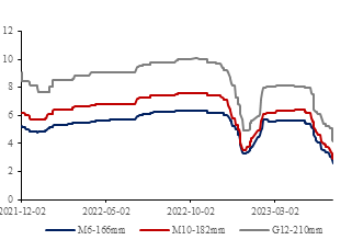 上半年硅料价格持续走跌,利润曲线一路下行,测算后可知已迫近一小部分高成本的小企业硅料厂,但距离大厂利润成本线还有一段距离。随着后期价格或跌破部分小企业的成本线,以及大厂硅料厂挺价因素,预计硅料价格下跌空间收窄。