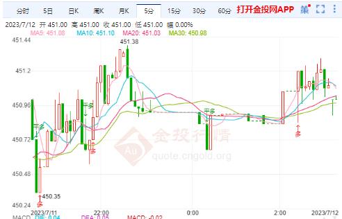 上海黄金交易所黄金T+D7月12日(周三)早盘盘初上涨0.13%,暂报451.03元/克,今日开盘报450.83元/克,最高触及451.38元/克,最低触及450.35元/克。