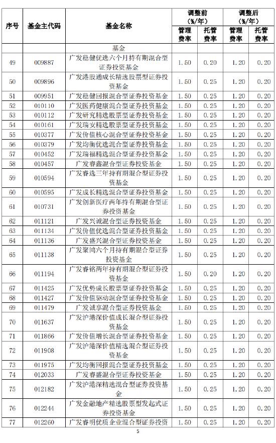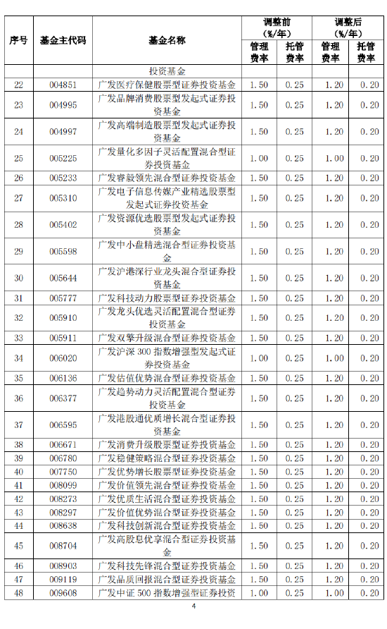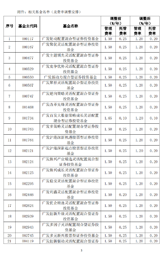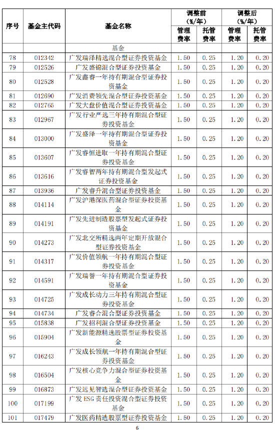 7月8日广发基金公告称,为更好地满足广大投资者的投资理财需求,降低投资者的理财成本,7月10日起调低旗下部分基金的管理费率及托管费率并对基金合同有关条款进行修订。具体看,本次下调费率涉及到广发基金旗下119只产品,相关产品的管理费率由1.5%下降至1.2%,托管费率由0.25%下降至0.20%。