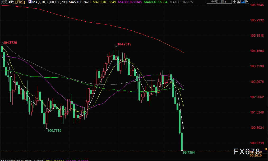 美元兑一篮子六种货币下跌0.8%,报99.738,稍早一度创15个月新低。美元指数势将创下2023年以来的最大单周跌幅。欧元兑美元上涨0.9%,报1.1220美元,稍早一度触及16个月新高。欧元兑美元连续第六个交易日上涨,创下今年以来最长连涨纪录。美元兑瑞郎跌至八年低点0.8583瑞郎,最新报0.8588瑞郎,下跌近1%。