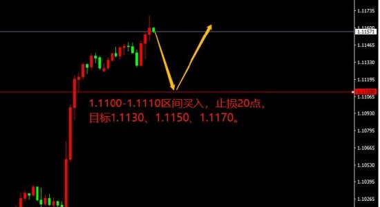 1.1100-1.1110区间买入,止损20点,目标1.1130、1.1150、1.1170。